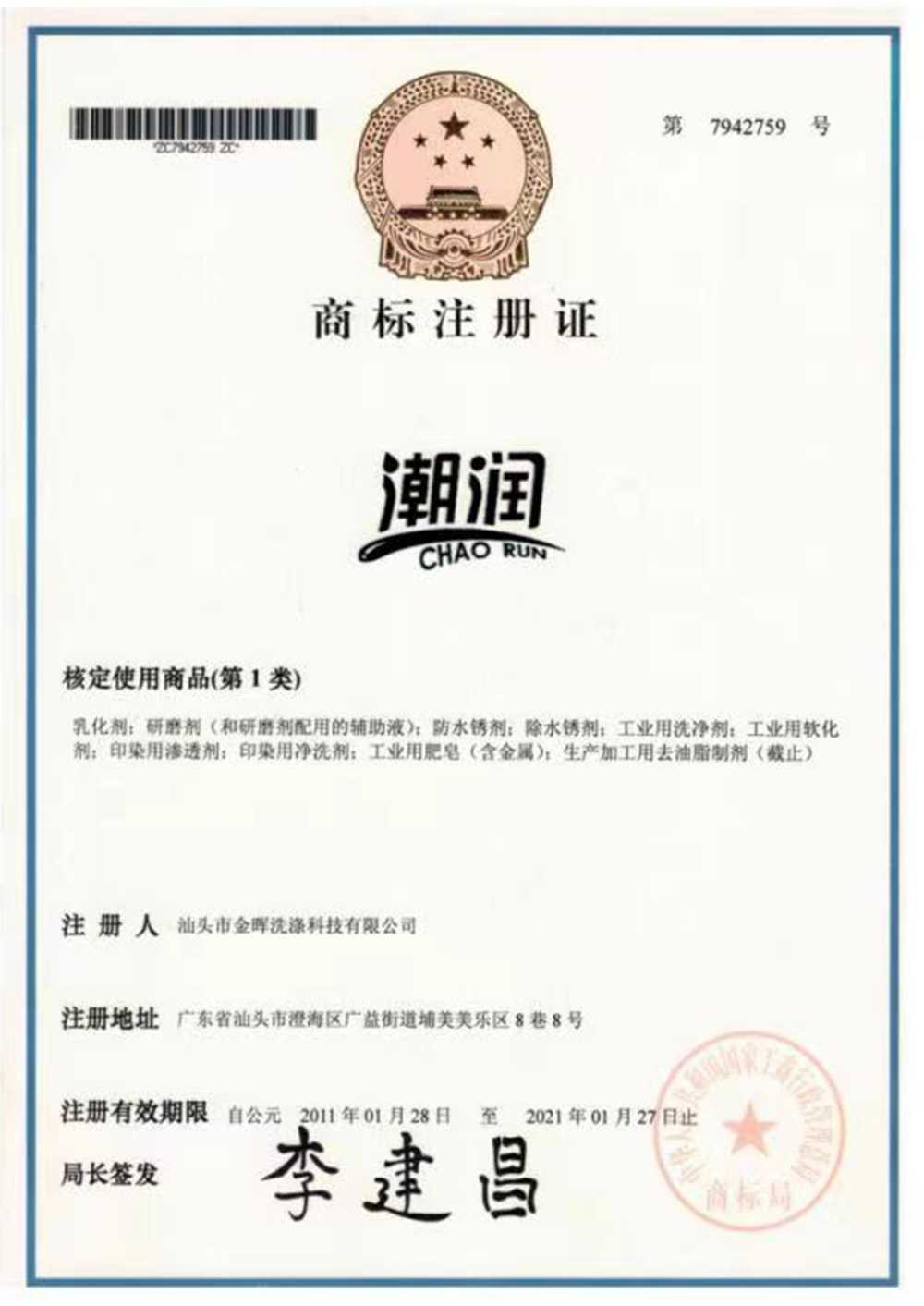 潮潤(rùn)商標(biāo)注冊(cè)證